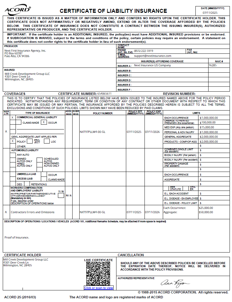 At Mill Creek Development Group, safety, quality, and accountability are the cornerstones of every project. Our comprehensive insurance coverage and two decades of experience provide peace of mind to homeowners, ensuring that your investment is protected every step of the way.